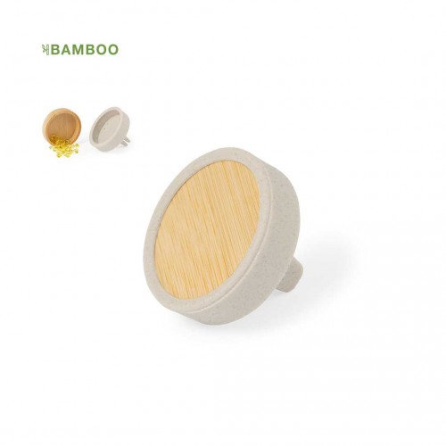 Ambientador moderno para carro feito de bambu e silicone, com aroma de limão para grade do carro. Apresentado em saco de papel kraft. Materiais como o bambu promovem o uso de matérias-primas naturais, reduzindo as emissões poluentes. É proveniente de uma planta altamente resistente e versátil, com rápido crescimento e regeneração, o que a torna uma excelente alternativa à madeira tradicional. A cana de trigo promove o uso de matérias-primas naturais, reduzindo assim as emissões poluentes. Cheiro de limão. Bambu/Silicone.