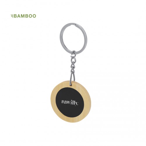 Chaveiro em combinação de bambu e metal. Com área de acabamento em borracha, ideal para gravação a laser com acabamento prateado efeito espelho. Materiais como o bambu promovem o uso de matérias-primas naturais, reduzindo as emissões poluentes. Provém de uma planta de grande resistência e versatilidade, com rápido crescimento e regeneração, sendo uma excelente alternativa ao uso da madeira tradicional. Metal/Bambu.