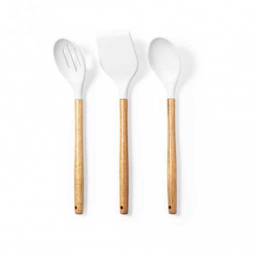 Conjunto de cozinha de 3 peças com cabo de madeira de acácia natural e acessórios de silicone. Inclui colher, espátula e escumadeira, com base de cerâmica combinando. Apresentação em caixa individual de design kraft. 3 peças. Cerâmica/ Madeira/ Silicone.