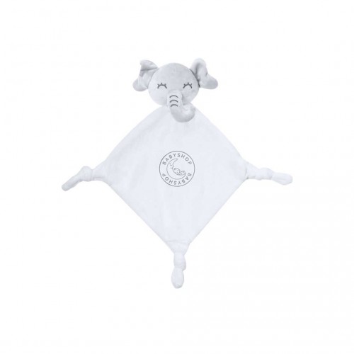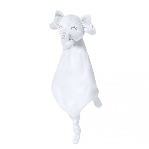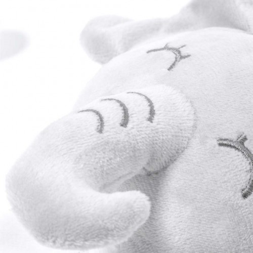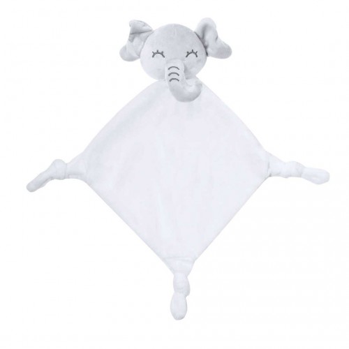 Lindo doudou com um lindo desenho de elefante branco. Com nós em cada um dos 3 cantos para estimular o tato do bebê, facilitando o relaxamento. Feito de uma única peça de tecido, para evitar que ele se separe em pedaços menores. Poliéster.