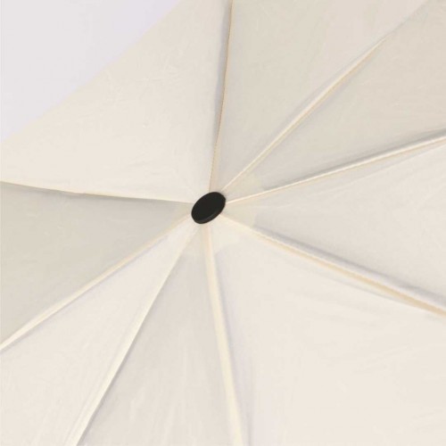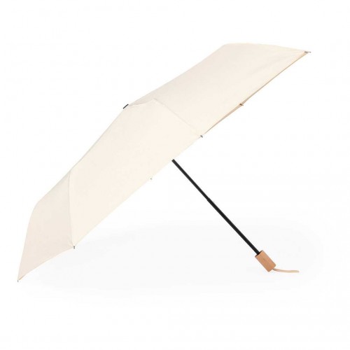 Guarda-chuva dobrável de 8 painéis e 106 cm de diâmetro, feito de material pongee 190T durável com acabamento natural. Abertura manual, com hastes metálicas pretas e tira com fecho de velcro. Cabo de madeira com cordão e bainha do mesmo material. 23". Cabo de madeira. Capa Pongee. Pongee 190T. Barras de metal.