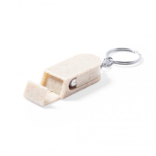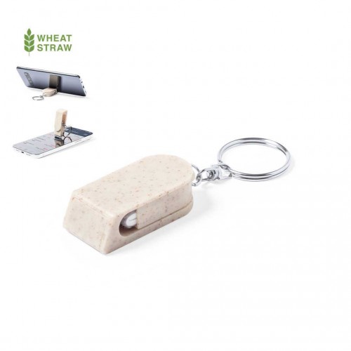 Chaveiro porta-smartphone da linha nature, feito em palha de trigo. Com mecanismo giratório e acessório de limpeza de tela incluso. Anel de metal cromado. Os talos de trigo promovem o uso de matérias-primas naturais, reduzindo assim as emissões poluentes. Limpador de tela incluso. Cana de trigo/ ABS.