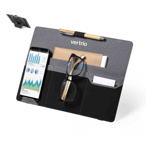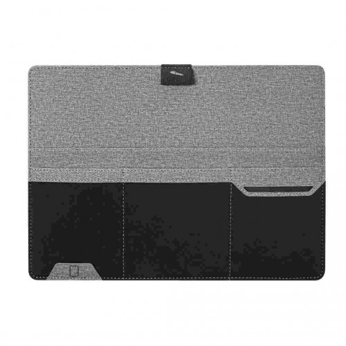 Organizador elegante e prático com suporte magnético, ideal para facilitar o trabalho ou usar seu laptop em qualquer lugar ou espaço. Feito de poliéster cinza mesclado durável com detalhes em couro sintético preto. Inclui um suporte para caneta e smartphone, com 4 bolsos elásticos para guardar diferentes gadgets. Poliéster/PU.