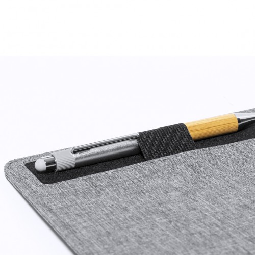 Tapete elegante e funcional feito de poliéster RPET macio. Com entrada Tipo C - cabo preto Tipo C incluído - e carregador sem fio de 15 W, compatível com dispositivos equipados com tecnologia de carregamento sem fio Qi. Inclui suporte para smartphone e suporte para caneta. Com base antiderrapante que garante estabilidade e conforto de uso. Inclui manual de instruções em espanhol e inglês. Apresentado em caixa individual de design kraft e saco reciclado.O material RPET é feito de plástico reciclado, incentivando a reutilização de resíduos plásticos e contribuindo para a sustentabilidade do planeta.Fabricado em conformidade com as normas RoHS e em conformidade com os seguintes requisitos de segurança: